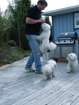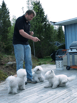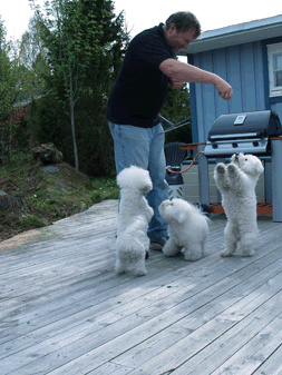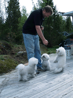 | Men, hva gjør Simba for å få en liten pølsebit? | Simba er 10.5 år, men kjempe sprek. På de neste bildene ser du hvordan han danser for å få en liten godbit. | |