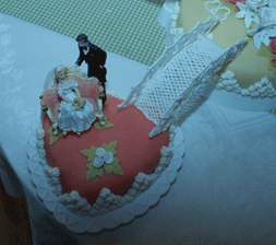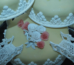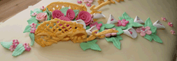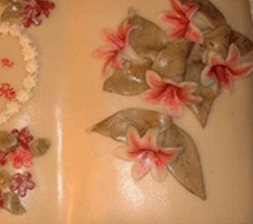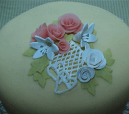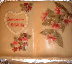 | Konfirmasjons kake | skråbilde av blomster kjærren. | |