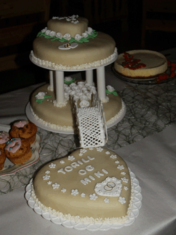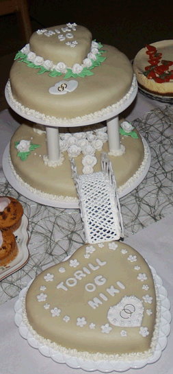 Bryllupskake vi lagde til noen venner. Sjokolade kake med marsipan trekk. | ![]() | |
