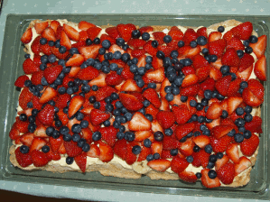 | Marengs bunn pyntet med krem og vaniljekrem, jordbær og blåbær på toppen | Sjokolade kaka | |