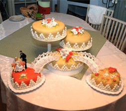 | Bruene er laget av eggehvite og melis | Pynt er laget av marsipan og iscing krem | |