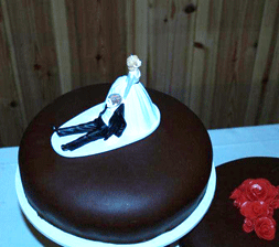 | Bryllups kake i sjokolade. | Det er sjokoladetrekk. | |