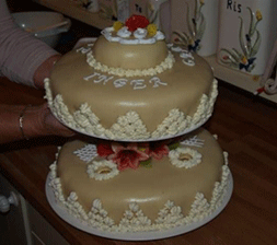 | 2 etages bursdags kake | Marsipan trekk og pynt | |