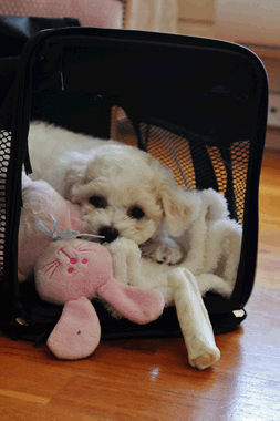 | Her er jeg reise klar. Bonny la seg inn i reise buret Nina hadde med og sovnet. Hun koste seg veldig. | Nina og Bonny koser seg masse før de tar toget til Bergen. Bonny var super flink på toget. | |