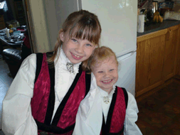17 mai på morgenen tikket det inn et nydelig bilde av to fest kledde jenter. Snart kommer de og skal hente Knerten. | |