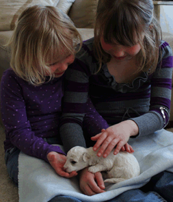 To spente jenter kommer å hilser på sitt nye familie medlem. Det var kjempestas. De klappet og koste. Ventetiden til Knerten skulle flytte hjem ble lang. Men Knerten var heldig og fikk besøk så han ble litt kjent med sin nye familie. | |